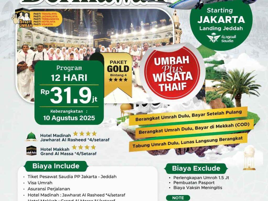 - DP 5 Jt/Pax untuk Program COD (bayar setelah setelah tiba di Tanah Suci).