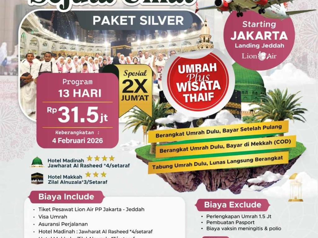 - DP 5 Jt/Pax untuk Program COD (bayar setelah setelah tiba di Tanah Suci).